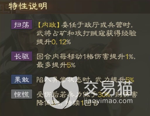此外夏侯霸的特性“长驱”,可以在每回合移动的时候根据移动的格子数来提升伤害,但最多提升5%。自身陷入debuff的时候获得5%武力提升。如果你将他放置在后政厅或者兵营里,也能提升少许占矿和攻打贼寇的经验。