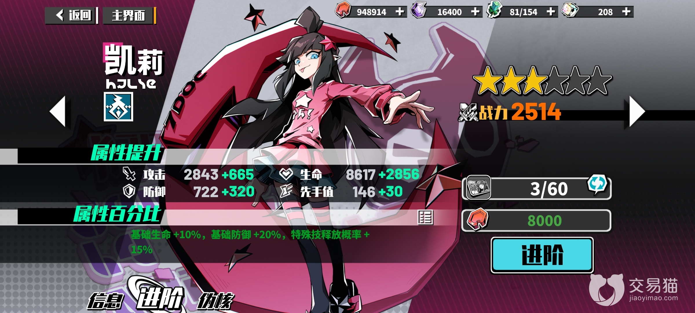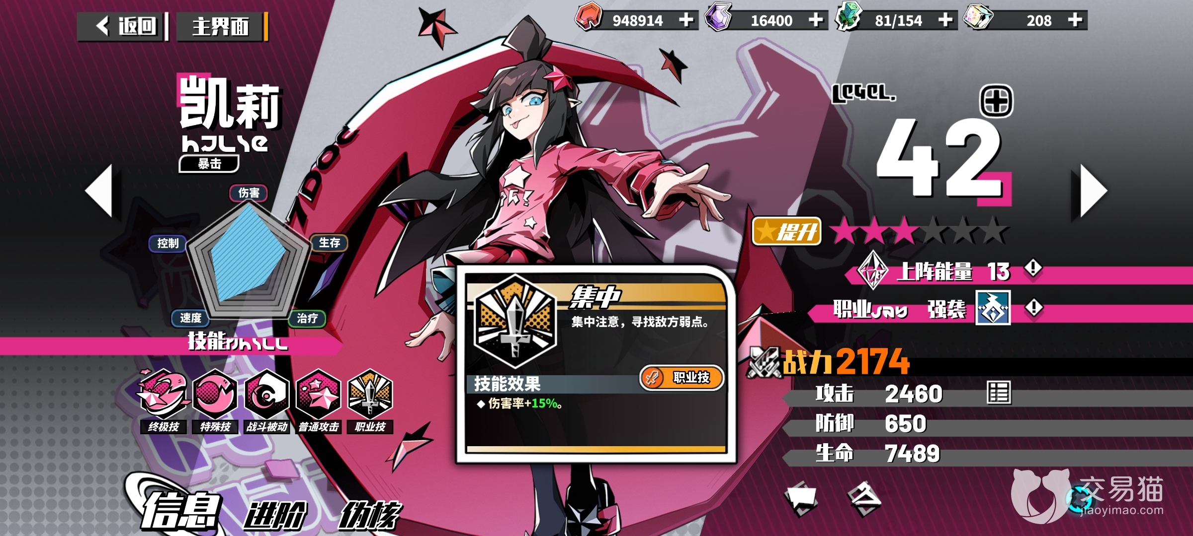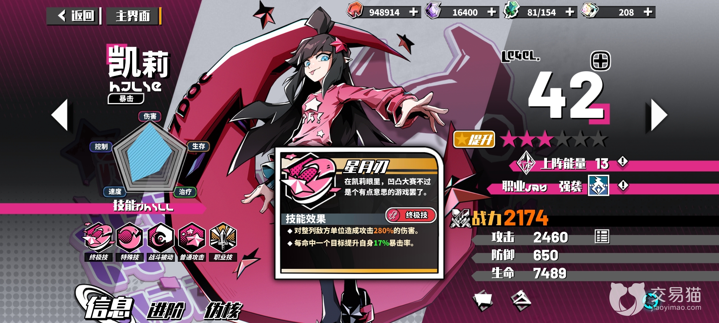 首先这个角色只要培养策略正确绝对是有传说实力的,这个角色进阶之后和没有进阶是有着天壤之别的,她的技能是整列的攻击技能,在游戏里面是很强的攻击模式,并且第一次升星之后可以进化大招增加攻击敌人获取的暴击概率,可以依靠提升爆伤增加自己的伤害。