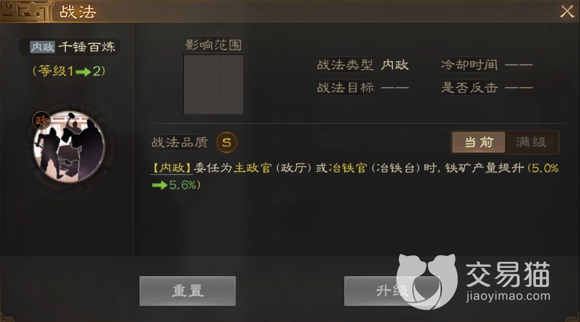 获取之后一般来说不会将其放到队伍中去战斗,而是应用于内政方面,这和自己属性与技能是分不开的。属性方面政治极高,这就带来了很高加成,自带战法千锤百炼,当被委任为主政官或者是炼铁官时候,己方铁矿产量按比例提升。小编的建议是直接委任成炼铁官,这要是节省出来的主政官职位可以安放更加合适人选,毕竟提升铁矿产量是一定的。铁矿是所有资源中非常珍贵的一种,前期非常紧缺,有了陈群的帮助就能减缓资源上的压力,尤其是后期百分比提升也是极其可观的数字。