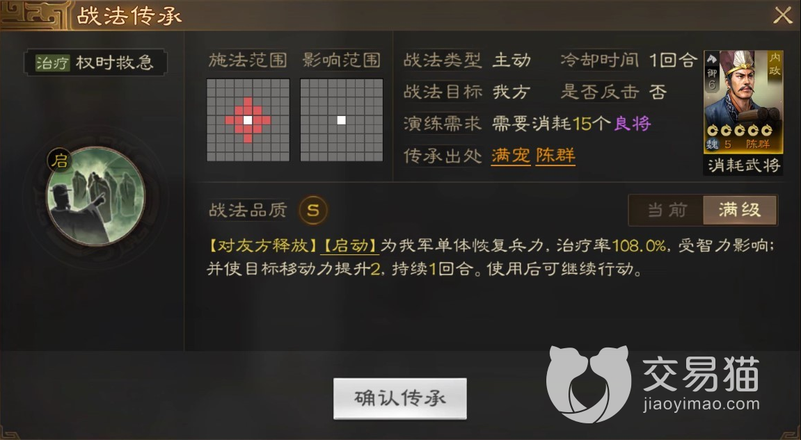 除此之外,还可以将它分解之后获得传承战法,效果是为我方单体目标恢复兵力,并且提高移动力,有了这两项效果,就使得此战法成为了非常强的单体辅助。提高移动力对于战斗布局来说是非常关键的,尤其是一些需要近战输出的武将更是如虎添翼。