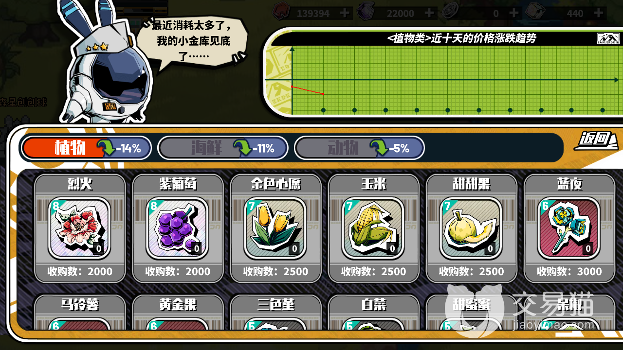 这里玩家可以屏幕右侧的草地上找到料理型裁判球,前期它以收购食材为主,从植物到海鲜,再到动物,三个分类,分别对应种植和养殖功能,然后每种食材都有价格的涨跌,推荐大家种植产出后,将材料囤到高价时卖出。
