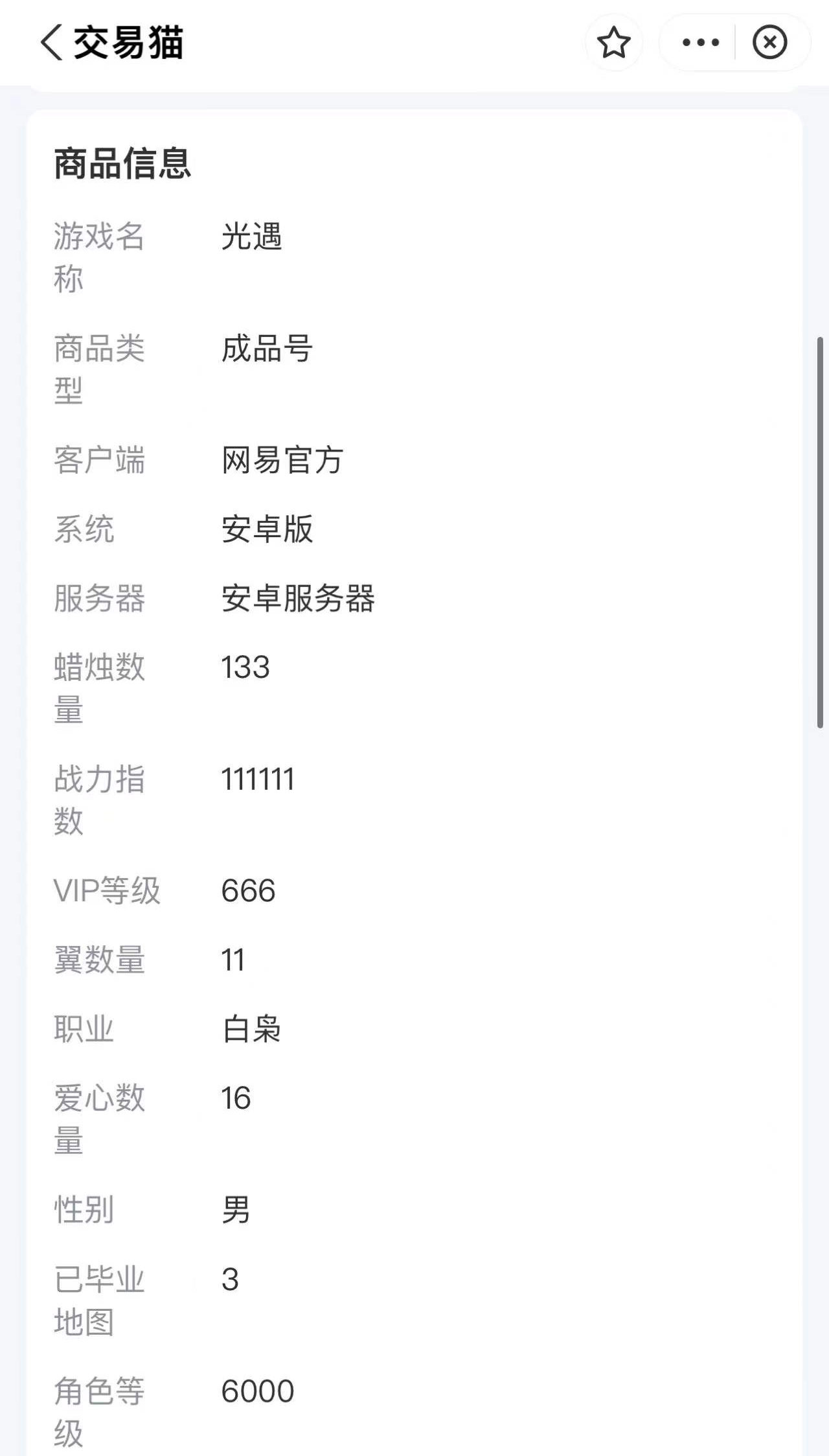 光遇的账号价值不是三言两语就可以轻松描述的清楚的,交易猫很好的考虑到这一点。可以让卖家在上传商品的时候,仔细的填写一下商品包含的具体价值,例如有多少极品角色、装备等,还有VIP等级有多高等信息,都可以充分地表达出该账号的价值。另外买家在查看的时候也不用太费力,可以一目了然的就了解到该账号的具体内容,因为详情排版是很清晰的。