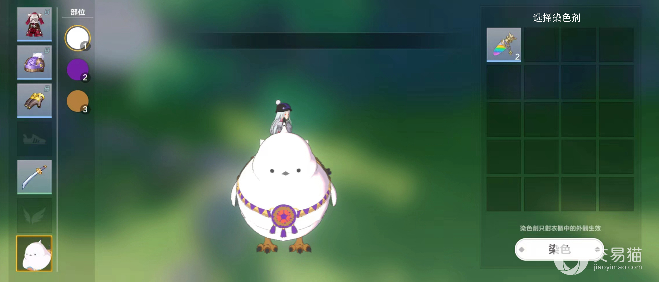 玩家还可以对自己已经拥有的坐骑进行染色。在坐骑的左下角有个“染色”的按钮,进入之后,玩家就可以使用染色剂选择不同的部位进行染色,不过染色是几个特定的颜色中随机选择来染色的,玩家不能自己选择染什么颜色。
