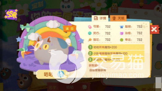 毕竟是花了钱的,所以猫咪的属性是全属性ssr级别的,这个级别的猫咪在游戏中本身就已经是不好获取的了,所以其实这个价格还是挺划得来的,玩家可以为自己的猫咪定制一个名字,这个猫咪的基础外观也是有玩家自主决定,只要大家将猫咪设置的精致一点基本上是不会跟其他猫咪有重复的机会。