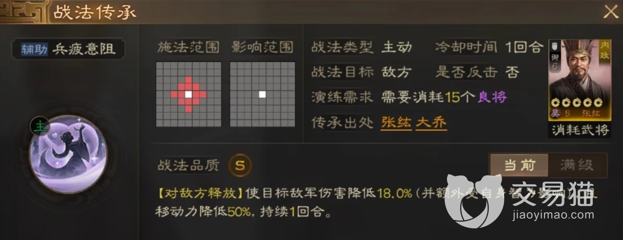 技能战法输出不高,可以让敌方团队的伤害和速度降低,主要就是用于辅助战斗,在牵制战中能发挥不错的作用,就是这个技能就不要升级了,毕竟只是作为控制使用,提升技能伤害没有必要,顶多就是附加一些特殊性的技能效果。