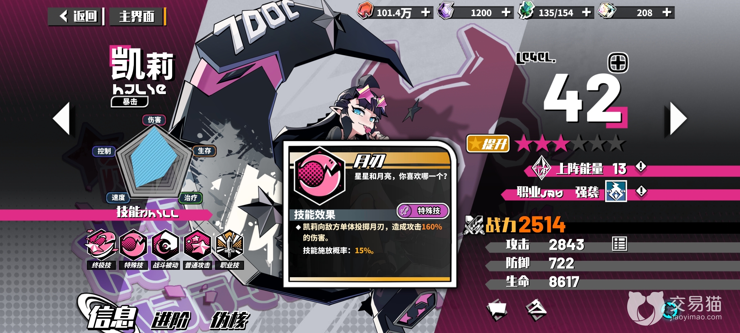 首先是大招星月刃,大范围的伤害技能,主要可以对和她一横排的敌人造成伤害,是很多范围c的伤害模式相同的,但是有一点差异就是这个技能享受高额的暴击概率,等到技能超觉醒之后会表现的更加明显,攒怒气非常的快而且伤害爆炸。