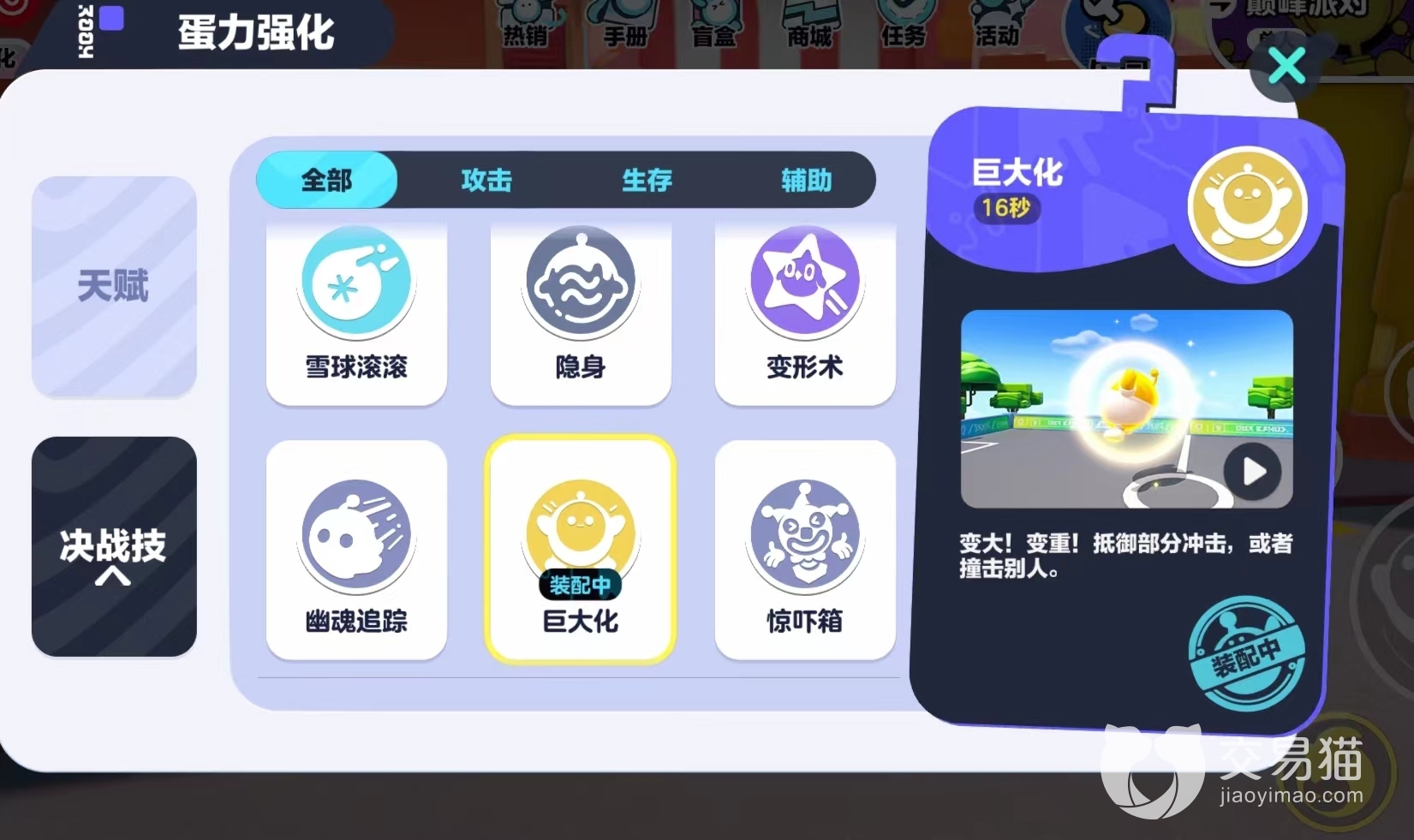 小蛋仔如果写要变成大蛋仔要借助的就是决战技中的一个技能,这个技能名字叫做巨大化,就像名字那样说的玩家使用技能之后就会在短暂的时间内变成一只巨大的蛋仔玩家。
