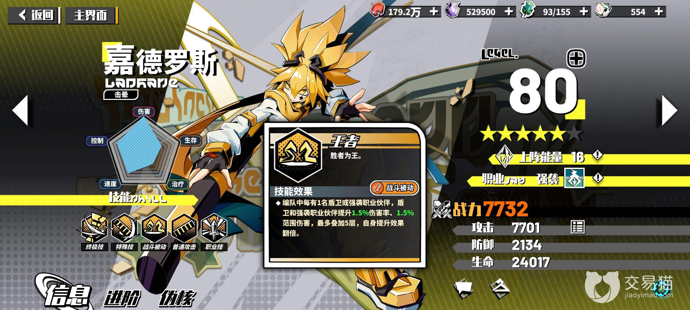 这个角色也是和上面的一样依靠开服up的优势基本上人人都会有,但是不一定是所有人都会去养,装备没有成型以及没有满星之前是完全比不上同阶级的雷狮的,所以抽取的优先级别靠后,主要就是他的被动王者非常的有用,登场之后给所有的队友都上一层增加伤害的buff效果,自身效果翻倍,并且本身是aoe类型的输出,安放位置也很自由,所以没啥练度之前当个副c绝对是超模的存在,但是既生瑜何生亮,可能大家的抽数都去搞雷狮了,也就让他的热度有些下降了。