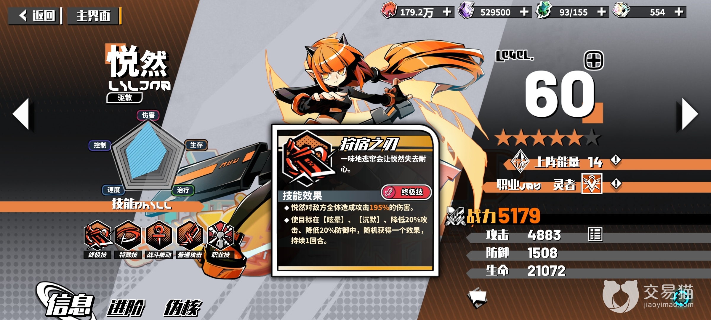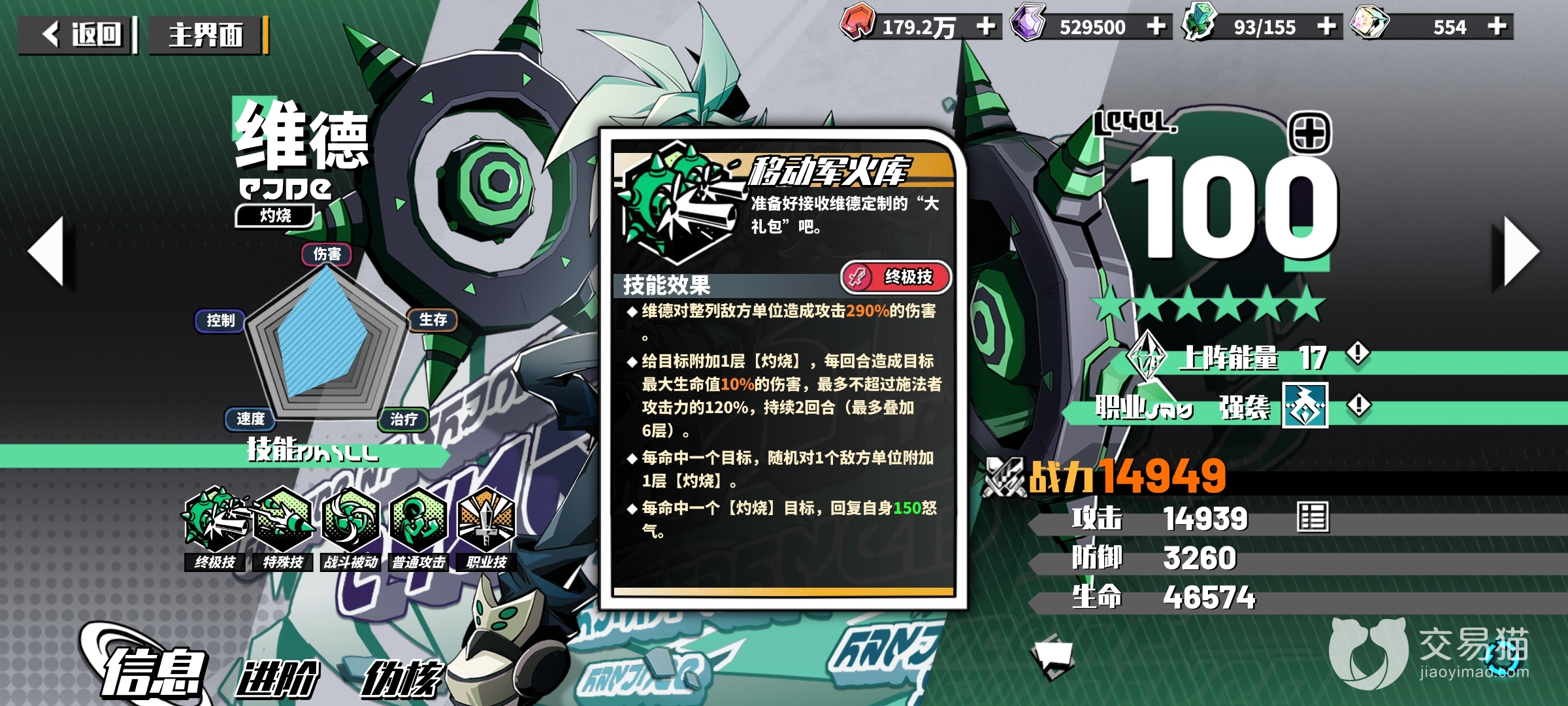 相比前面三位神仙角色这个角色就逊色不少了,但是依靠特殊的机制还是能当一下t0的守门员的,因为攻击机制的问题只能放在中间一行,最佳的位置在天使的前面一格,留一个位置上坦克保护它输出,只要能保证在上嘲讽坦克之前不死,这个角色就是无敌的,四星之后加上安神就是完全体,烧灼的效果挂上敌人之后敌人血量越厚越舒服,基本上每回合都能烧一次敌人还能放一次大招,输出能力持续且高能,越级作战首先会想到的角色,虽然没有up但是不少玩家还是会想要培养这么一个持续的输出角色,能够解决很多又肉又有恢复的敌人。