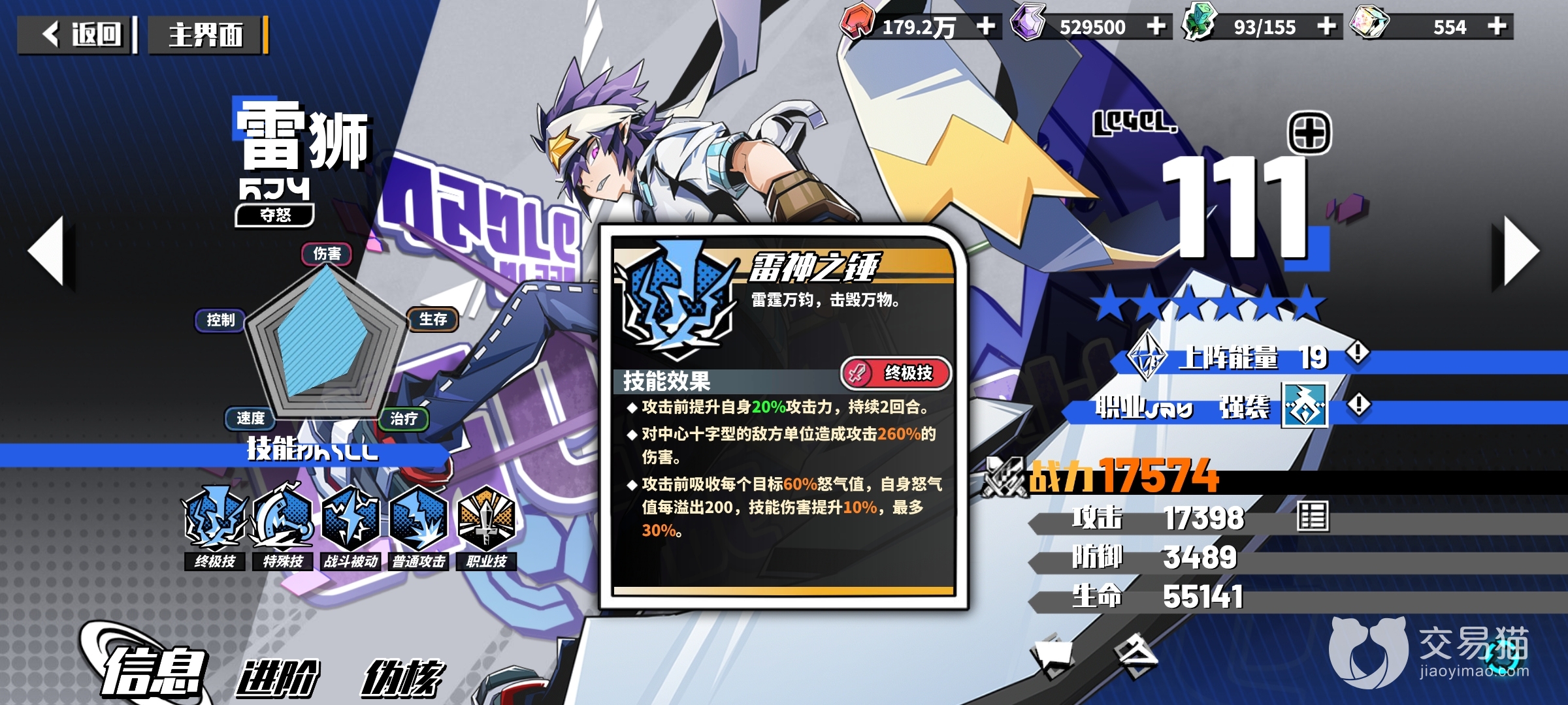 持有率没有百分百也有九十九的最夸张的角色,十字的攻击模式让他傲视群雄,可以在八个位置上随便挑选站位并且上场时机也灵活多变,技能效果bug满星之后就是游戏最强没有之一,入场直接雷神之锤吸收怒气增加伤害,上场的同时还会触发被动雷神,六星穿透25%的防御并且增加己方的怒回减少敌方的怒回非常的霸道且强势,特殊技能虽然是画龙点睛但是驱散的效果偶尔也能发挥超强的作用,实力配的上自己的称号,当之无愧的王者角色,趁着up到达六星直接让游戏难度下降一般。