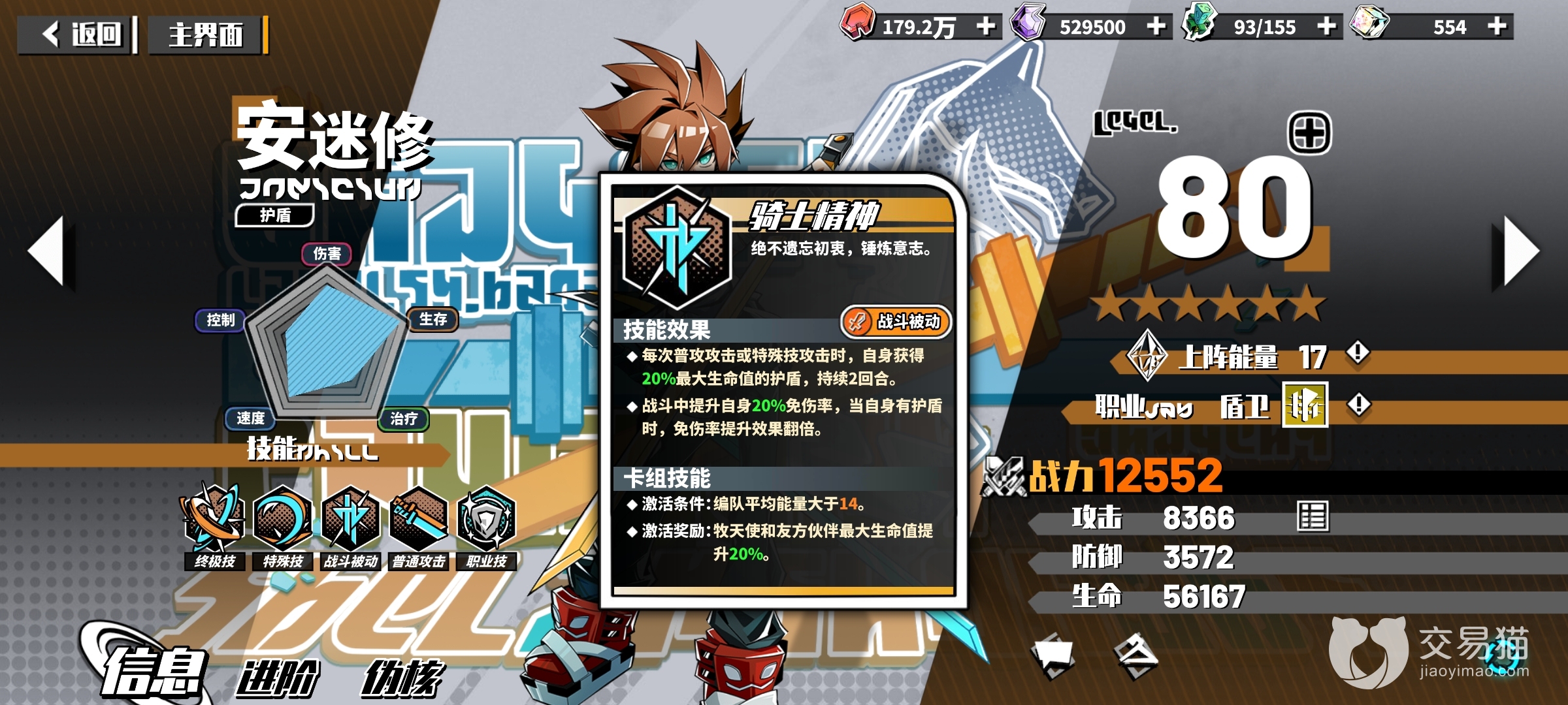 所有角色当中唯一一个不依靠up可以站在持有概率最高峰的橙色角色,除了主角之外就是安神有这个实力了,大招冷热流灼烧加减免伤独一档,觉醒还之后还有超级护盾和一回合嘲讽,这个技能效果完全超出一个坦克角色该有的水平,六星之后还能激活卡组效果,20%的全队生命up效果无可替代,没有的换也要换出六星的首要角色,还没有六的就去商店兑换碎片吧,相比同行的盾卫简直不是一个次元的存在。