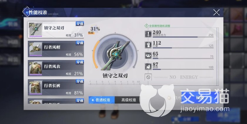 然后是校准,直白点就是随属性,分为普通和高级两种,消耗材料也不同。普通校准是把装备的属性全部重置,高级校准是针对某一项调整,同样是优先洗武器,装备凑合用,攒好资源到后期慢慢洗。