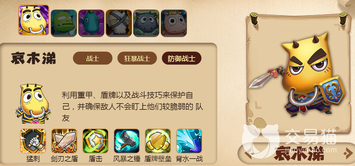 这个角色在游戏内选的人比较少,属于一个防御型角色,自身坦度很高,但是伤害效果一般,如果在单体对战中,这个角色拥有很强的优势,可以慢慢的消磨对手血量,如果是在群体作战更是能为队友抵挡伤害,还是很不错的。