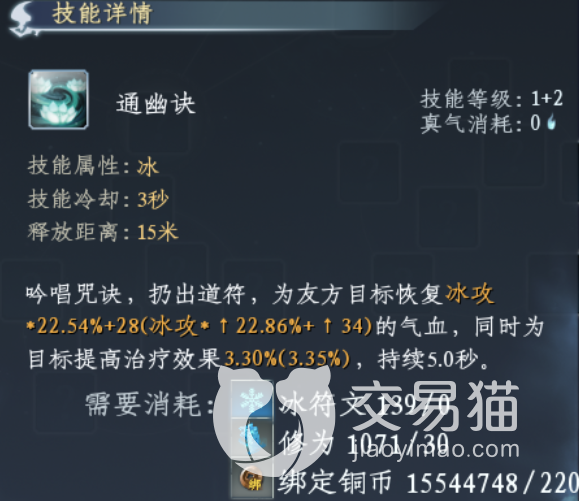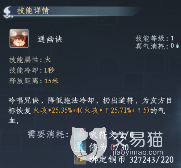 其实这个技能的属性并不是很强,它的主要作用就是回血,而这里回血的效果是受到角色攻击力影响的,所以有时候就很不实用。除了这个属性的功法之外,通幽诀中的木,土,雷还有冰系都是需要在澜氏人员那里购买的。