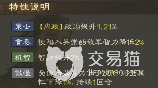 在深入一点来看就是,这人的智商比较高,所以他作战的方式就以这方面为主,而即便这个属性是里面最高的,但其数值也就只有八十四。而他最低的是魅力属性,数值就只有二十点几,其武力值也就只有二十多。