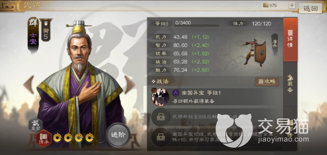 士燮这个角色算不得名将,在群雄的行列当中,这个角色的稀有程度不高但是属性上还是比普通程度的兵要高很多的。咱们可以看士燮的智力属性是他的五种属性内最高的,因此玩家如果想要使用一定要了解清楚这个角色的定位。