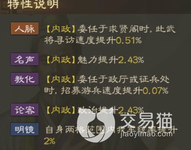 这个角色在特性上就只适合在朝堂内给玩家出谋划策,不仅可以提升美丽还有助于玩家政治的快速提升在招兵速度方面也会得到额外的数值。