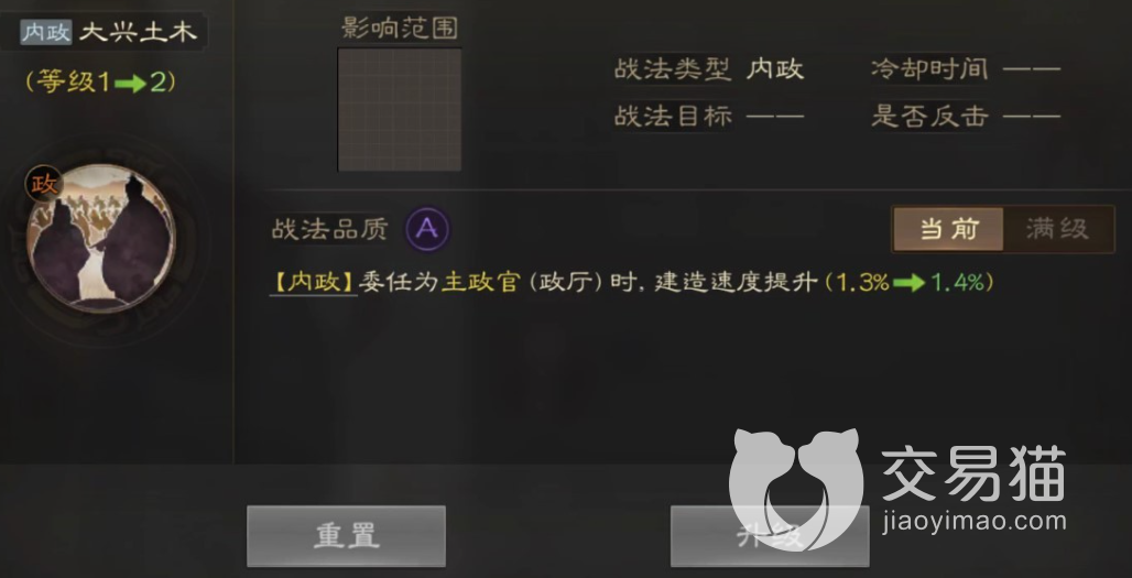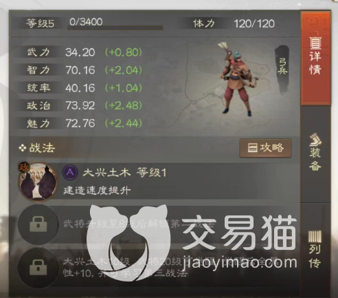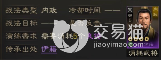 除了上述的面板和兵种配置外讨论阵容的核心关键就是战法了,战法方面伊籍的自带战法是一个内政战法,对战斗没有帮助只能用于后勤,效果是提升建造的速度,最高为2.5,另一个战法同样是一个内政后勤用的战法,该战法的效果同样是提升建造速度也是满级2.5的加成。