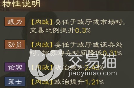 对了伊籍还有四个不错的特性,都是用于内政的,在内政厅里的时候,他的内政属性hi提升3.64,并且还会降低招募的时间提高交易的比例,这几个效果还是不错的,搭配上一些同样有增益特性的内勤武将,后方的经济发展会非常的好。