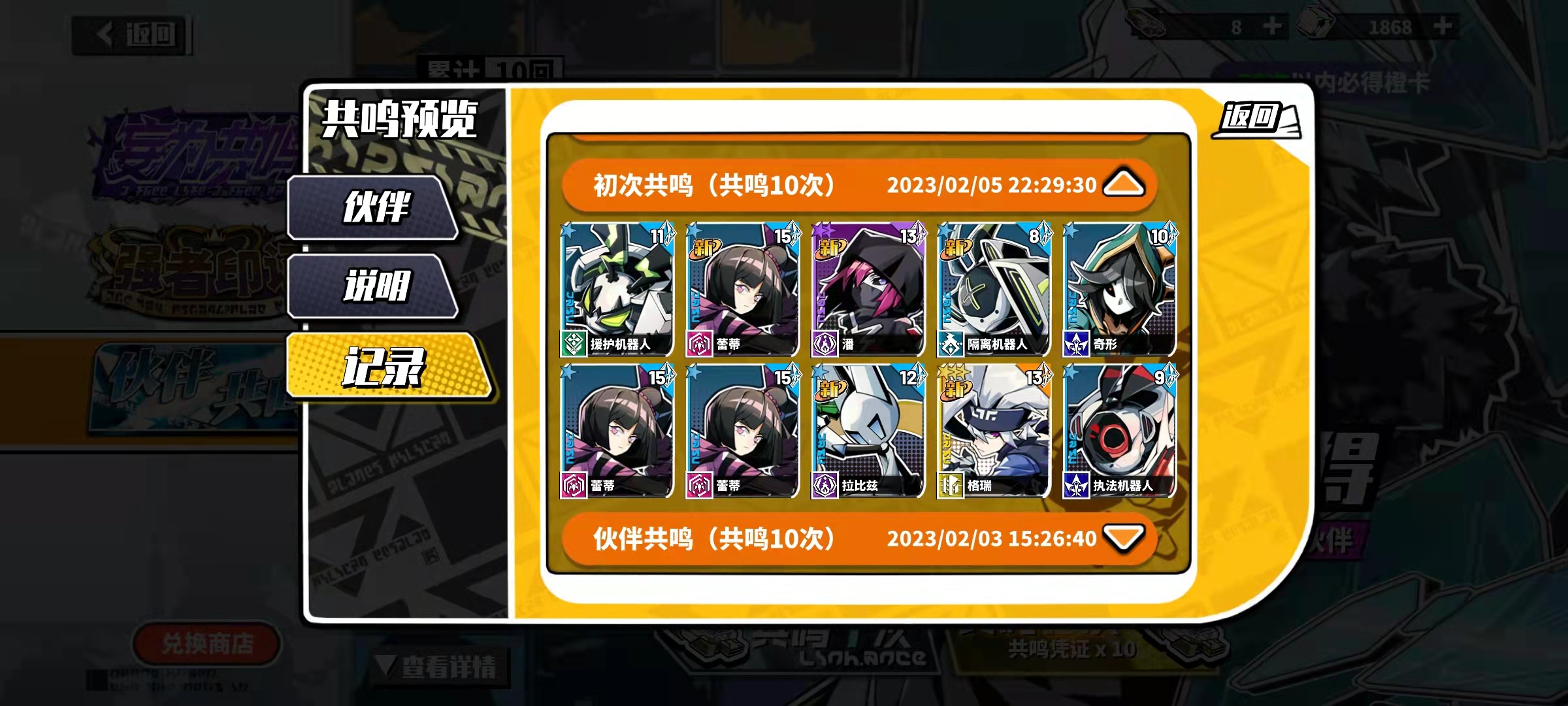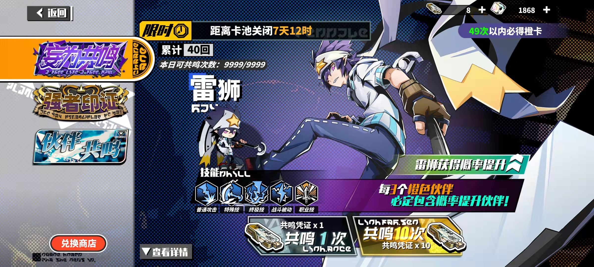 最后就是常驻的伙伴共鸣,它里面出橙卡的几率都是一样的2%,不过每十次就能必得一张紫卡,每一百次也会必出一张金,在下限上会更有保障。