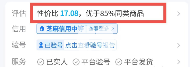买号我们也会担心性价比,交易猫会有海量的福利活动,领取优惠券是可以低价捡漏的,同时为了保障每一个买家都能买到性价比高的账号,平台也会专门对账号进行评估,我们在账号详情界面可以看到当前账号的性价比,以及与同类商品之间的对比,玩家们尽量选择性价比高的,这个功能还是很实用的。