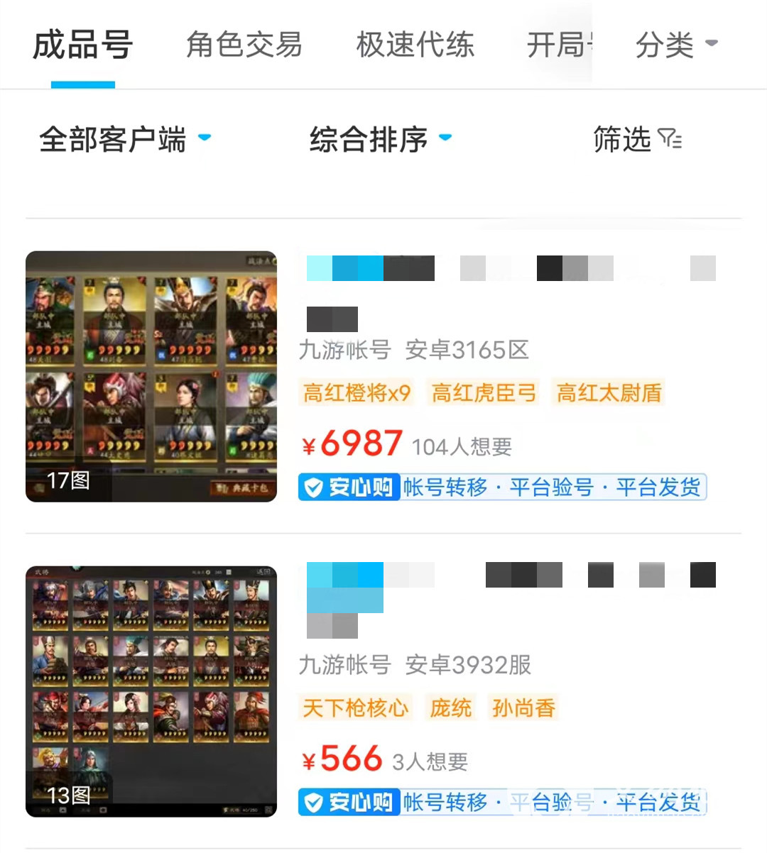 以上就是小编收集到三国志战略版卖号平台怎么选的全部信息,作为目前较为火热的游戏账号交易平台,交易猫获得了大量玩家的认可,并且交易猫的每一个买家都需要经过实名认证,且交易方式为三方交易,买家必须在登记信息的情况下,将交易金打给交易猫才能获得账号,这可以保证大家不会先给出账号才能拿到钱的情况,更不用担心买家在购买账号前一刻临时砍价的情况。