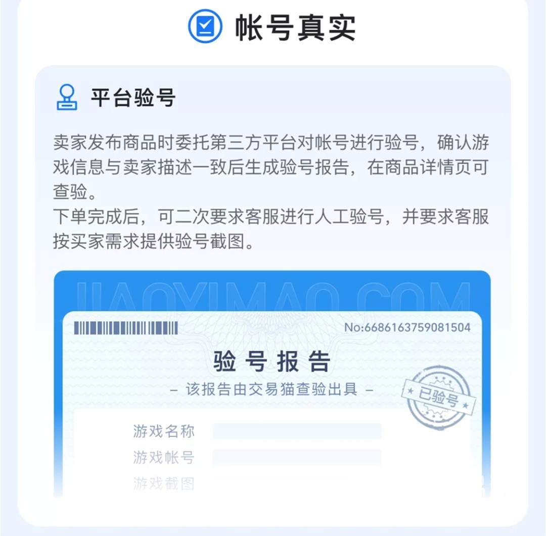如果想要在交易猫进行账号交易的话,平台首先会要求用户进行实名认证,这样就能很好的杜绝虚假交易的事情出现;并且交易猫还会对商品进行验号,进而保证商品页面信息与账号真实信息符合,大大的加快的账号的出售几率。