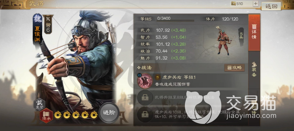 在属性面板只能挂可以看到夏侯渊的物理和统率值都比较高,所以不管是个人武力还是统兵的能力都比较强,因此玩家可以用来当做主力输出来进行搭配。而自带战法“虎步关右”是能够对敌人造成2次普通伤害的。而夏侯渊所带领的是弓兵,有着极高的射程,这样面对一些后排输出的武将有着更好的克制效果。