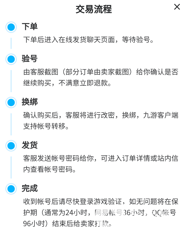 1.要说正规,交易猫的确配得上这样的形容词,首先交易流程非常规矩,整体分为五个步骤,没有太多的花里胡哨,大家按部就班操作即可完成交易,另外,平台中的商家都有交易数据,其中涉及到成交率、满意度等KPI,大家在下单之前也可以简单了解了解,看对方是不是个合格的卖家,再进行交易不迟。