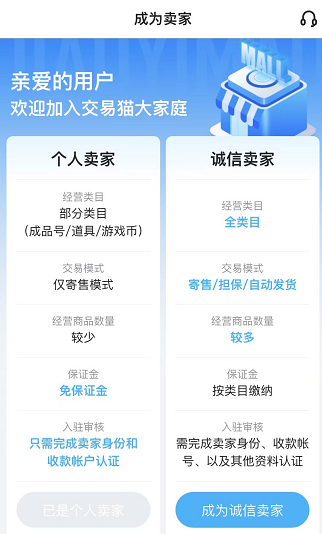 拥有超全的账号种类,而且交易猫运行多年,针对于这种连体账号的话,也有自己独特的出售方式,玩家们只需要在其中搜索对应的游戏,就可以连带着我们的vivo渠道号一起上传了。玩家们在上传之前需要先认证一个卖家身份,我们只需要点击我的,进入个人中心,在这里选择成为卖家,就有两种卖家身份可以选择,个人卖家以及诚信卖家,身份不同,可以经营的类目以及选择的服务都是不一样的。