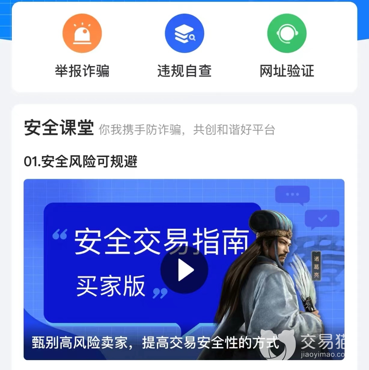 交易猫平台的安全性是每个用户有目共睹的,平台也是从多方面入手比如安心购保险的推出、用户全员实名制、卖家验号功能等等,除此之外用户还可以利用安全中心保护自己的利益,举报诈骗、违规自查、网址验证等功能都可以自行使用,如果是第一次使用的用户建议先查看下安全课堂中的视频,一定可以帮助到大家解决很多疑惑。