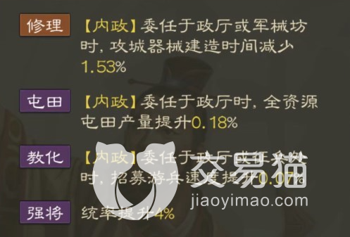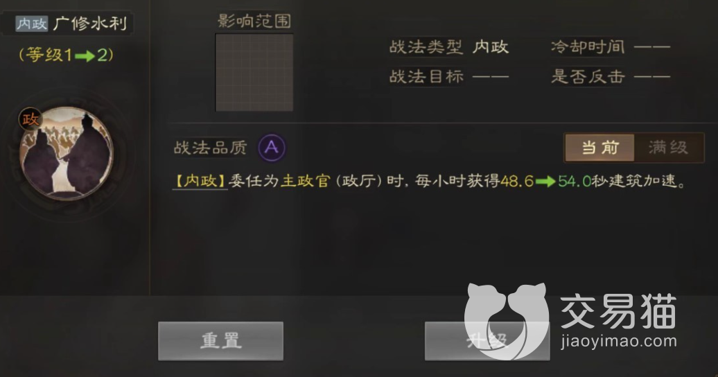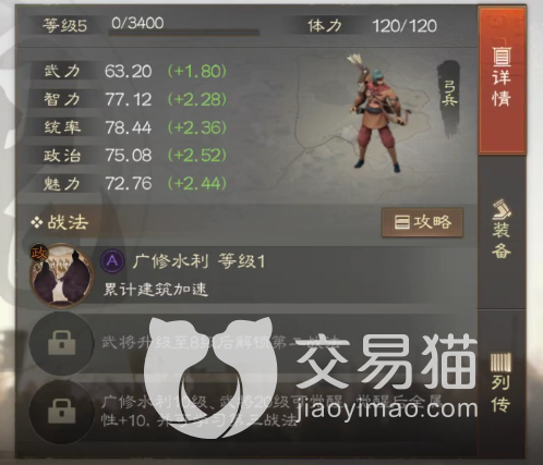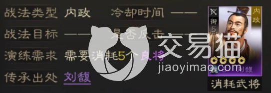 说明原因之前要先给大家说一下这名武将的战法配置,首先是自带战法,他的自带战法是一个完全内勤用的内政战法,效果是获得建筑制造加速,最高可以提升54秒,这个战法完全无法用于战斗,传承战法和自带是一个属性都是建造加速不过传承战法满级以后可以最高获得97.2的加速度,这么看来刘馥只能做为后勤不能出现在正面战场上。