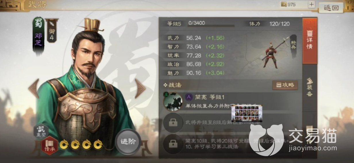 邓芝在游戏当中是蜀国将领,稀有度肯定比那些名将要差点。从数值上看邓芝这个角色的政治和魅力属性都是相当的高的,特别是魅力属性达到了90以上的数值,这个数值在不是名将的将领当中是非常不常见的,因此玩家们一定要好好利用这个角色。