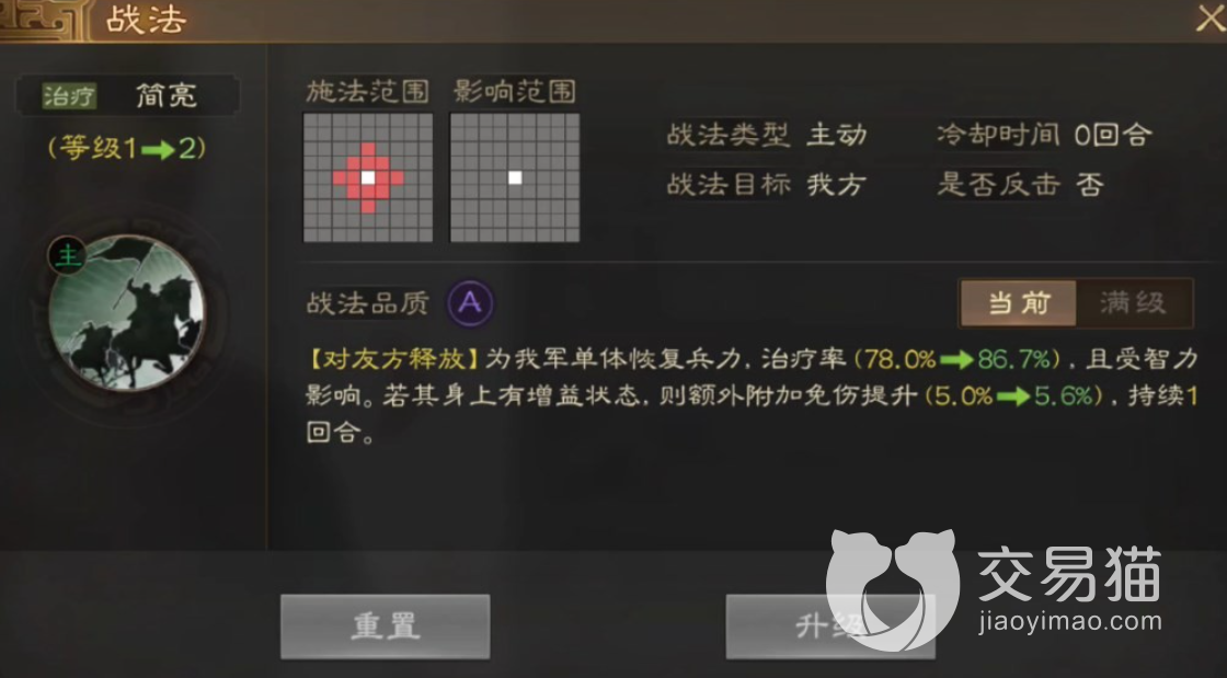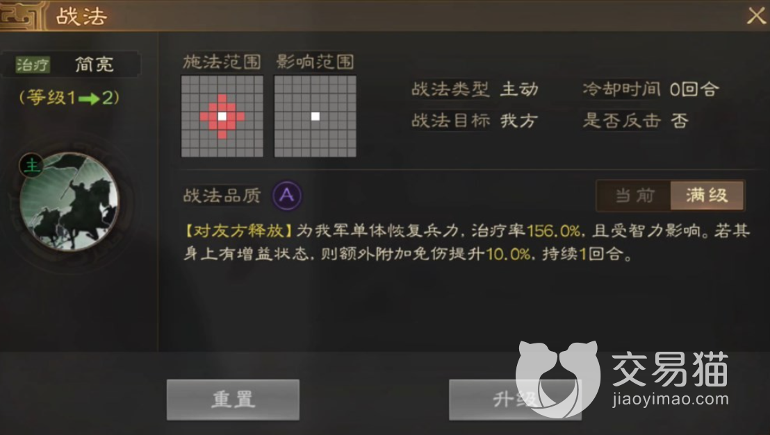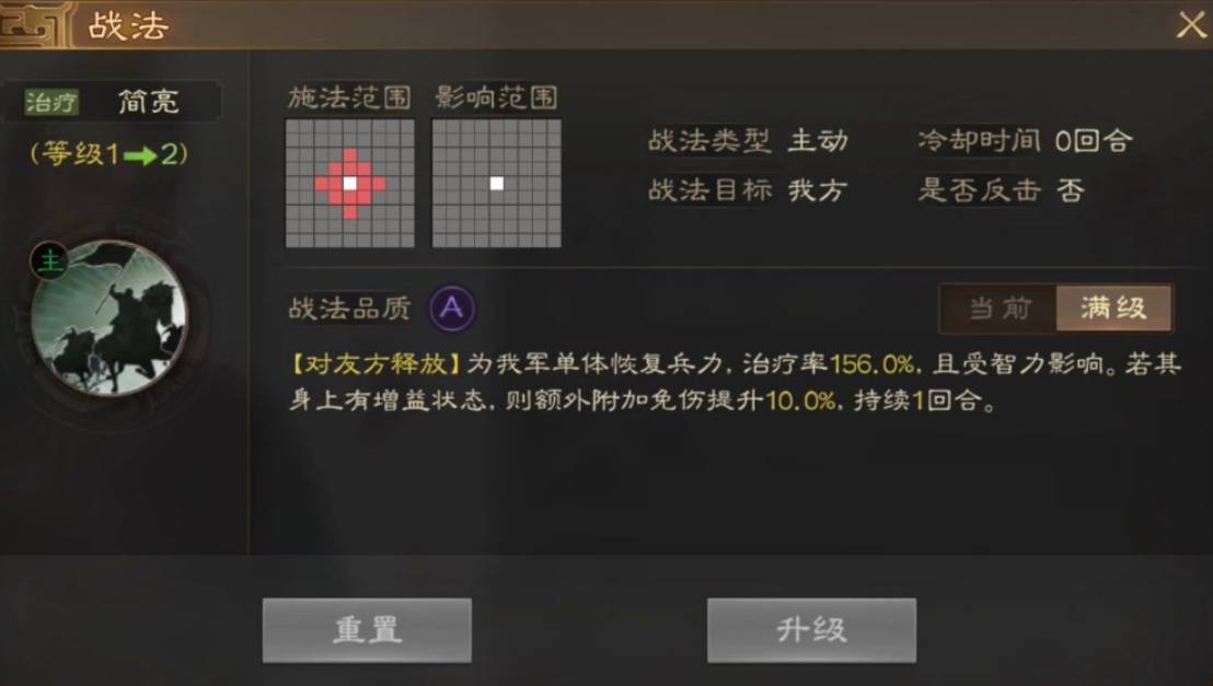 战法升级后则会迎来治疗率的巅峰,战法到达顶级之后给我军治疗每次都能够达到百分之一百五十六,并且增益也会大大提升。这简直就是移动的治疗站。