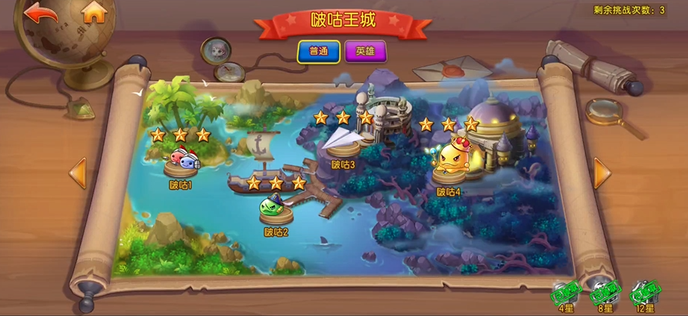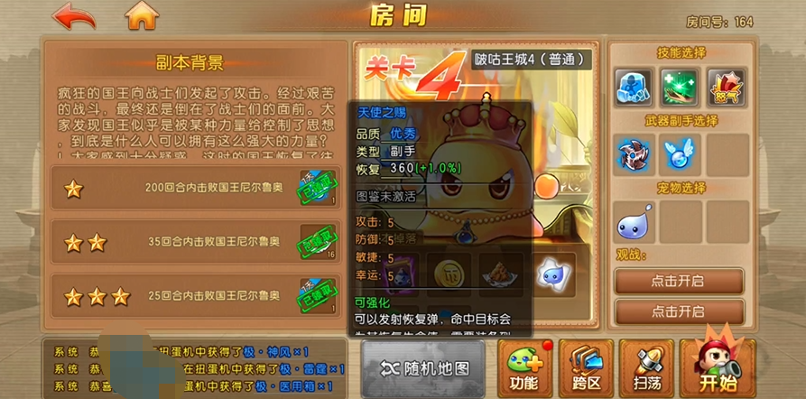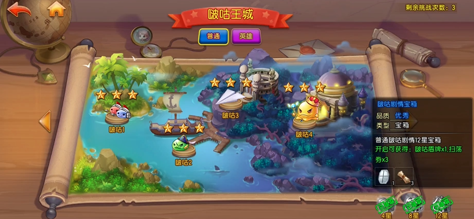 首先是天使之赐,这个的获取相对更简单,只需要打到啵咕4关卡,然后拿到该副本的一颗星即可,关卡的每颗星都对应着各自的目标,想拿到天使之赐只需要玩家在200个回合内击败这关的国王boss即可,对于长期玩的朋友来说,这是非常容易的,当然,如果你能二十五回合内击败它,也能拿额外的珍稀奖励。