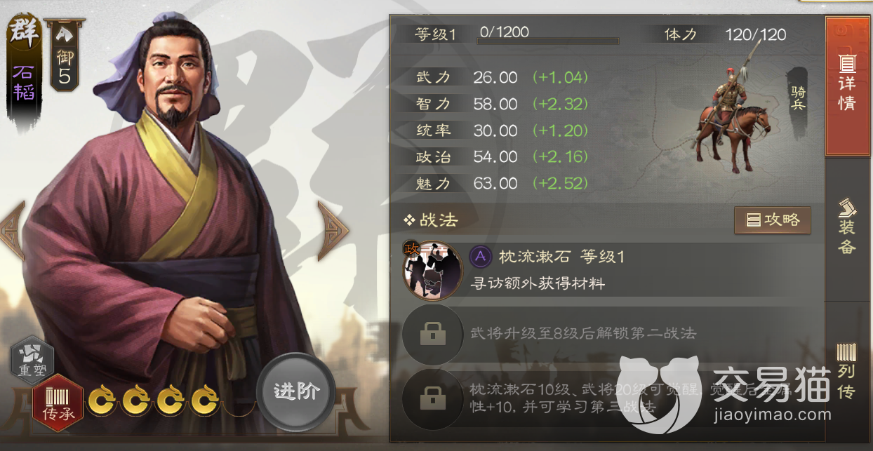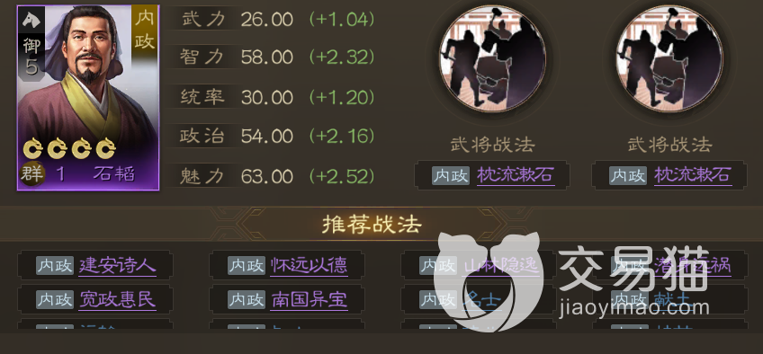 那么关于“三国志战棋版石韬怎么样”的内容到这里就介绍完毕了,该角色总体来看还是偏向于服务内政的武将,其两个战法升满后一共可以提供多达4.8%几率来获得额外装备,在次数多了以后,出装备的概率还是很大的,因此前中期可以适当培养他担任寻访使。