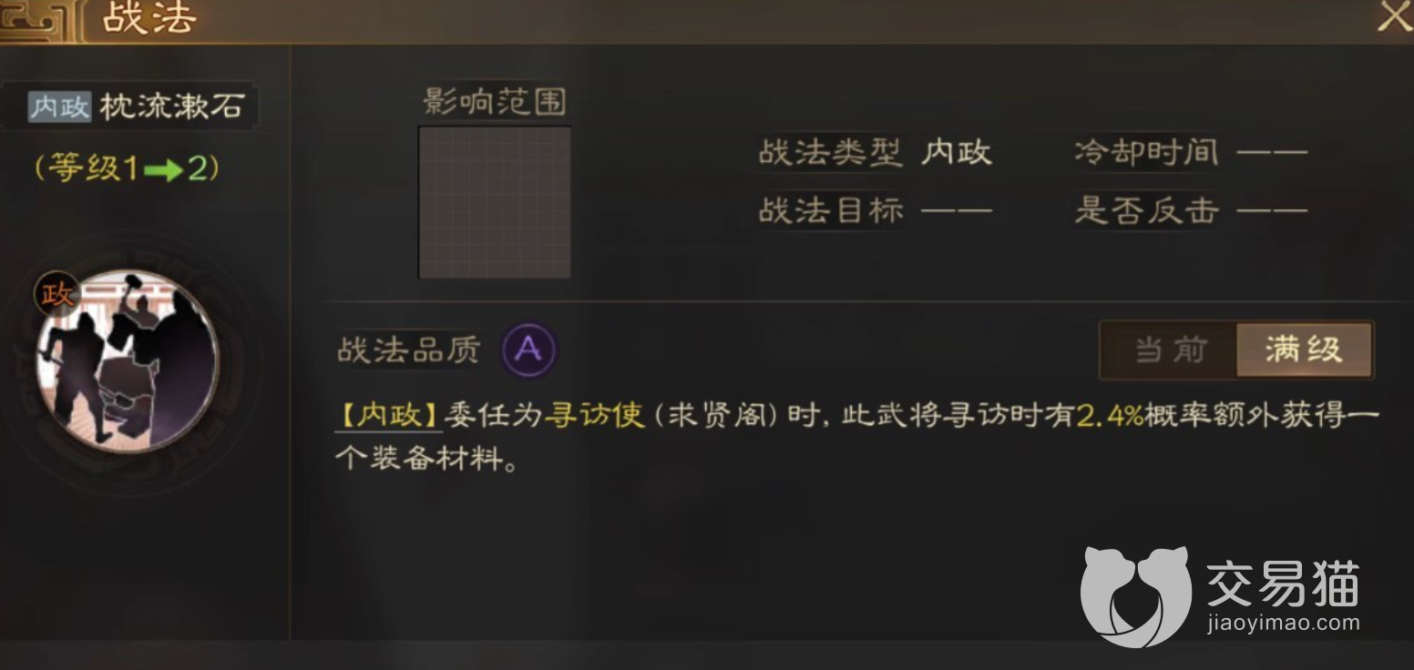 紫卡基本上两个战法都是一样的,石韬也不例外,他的战法是“枕流漱石”,属于内政层面的战法,对于战斗并不能提供直接的帮助,但在被委任为寻访使的时候,有概率在寻访武将的同时额外获得一个装备材料,这无形之中为你阵中武将的装备又多了一份选择,如果是高品质的装备,更是能在战力上起到明显提升。