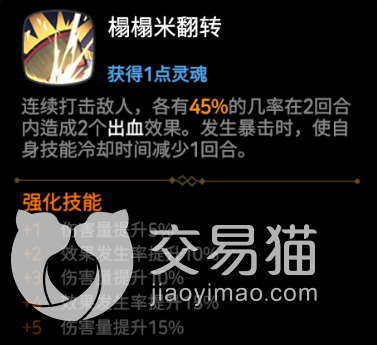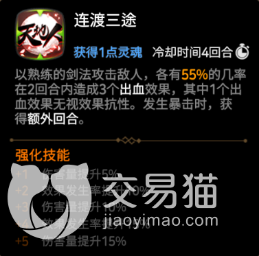 连续攻击敌人,每一次攻击都有一定几率让敌人在接下来的两个回合造成流血效果,如果在攻击的时候产生了暴击效果,那么此技能的CD减少一个小时。