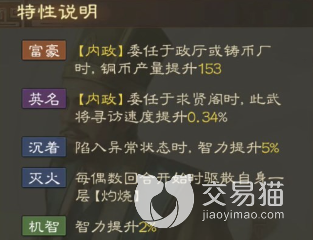而糜竺的特性,当委任政厅或者铸币厂的时候铜币的产量能够提升153,当玩家在缺钱的时候可以将糜竺派遣打铸币厂任职。而糜竺在求贤阁任职的时候武将的寻访能力可以提升0.34%,虽然不是很多但是玩家在没有政客的时候使用还是非常不错的。