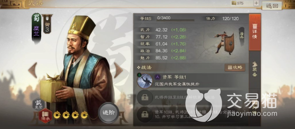 糜竺作为一名幕客,没有强大的输出能力,但是由于智力、政治和魅力都比较高,所以是一名合格的政客人选。然而糜竺的战法技能是能够使周围两格范围内的有友军全属性提升40点,所以这个能力在战斗的时候比较全能。