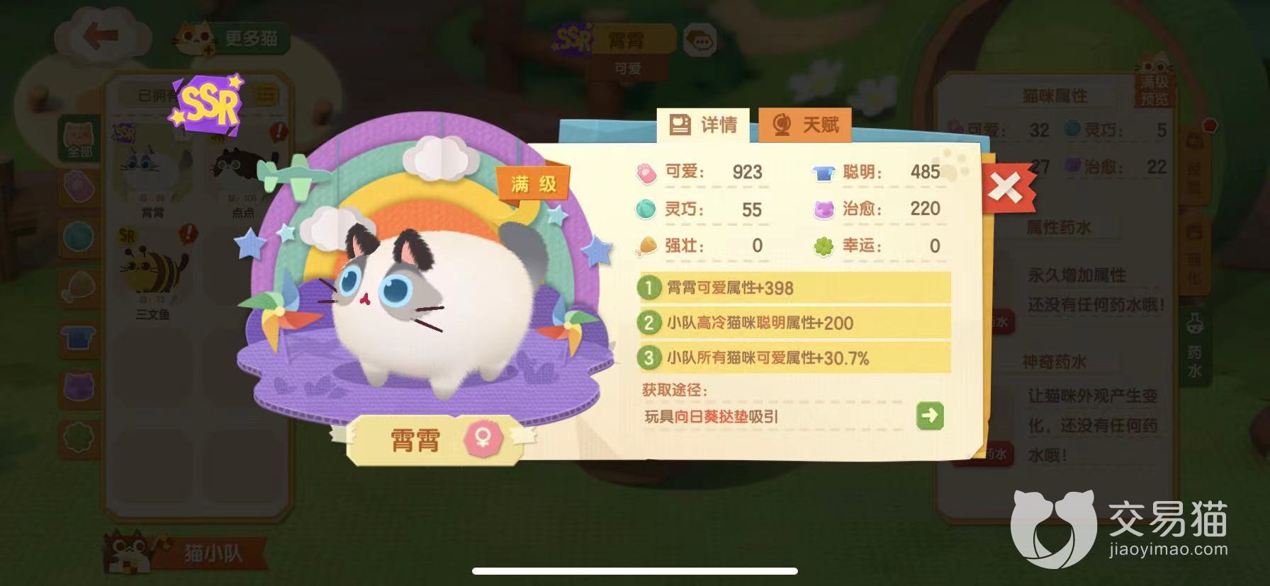 最后一个要给小伙伴们推荐的就是我们的霄霄了,它也是目前游戏新手期唯一会赠送的SSR猫咪,获取难度很低,基本上我们只要完成前期的新手教程就可以轻松解锁,这个猫咪带个可爱的小帽子,可爱值以及治愈效果都是很不错的,性格比较高冷,可以为我们一共一定的聪明继承,可以为小队的所有猫咪提供可爱加成哦。