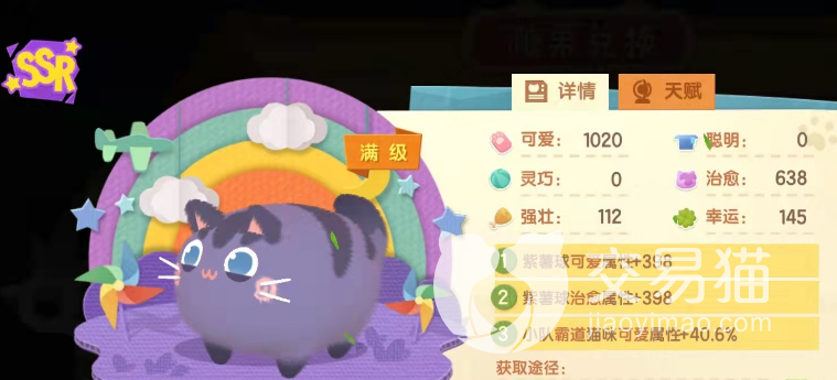 第二个要给大家推荐的是紫薯球这个小猫咪,大家别看它浑身都是紫色的,但是人家也是一个可爱的女孩子呢。可爱属性满级的话可以直接破千,还有一定的至于效果,在做任务的时候可以帮助小队提升可爱属性,玩家们可以使用菠萝泳池玩具吸引获取哦,是一个很值得培养的后勤人员,玩家们可以围绕它的三个词条开展增幅工作哦。