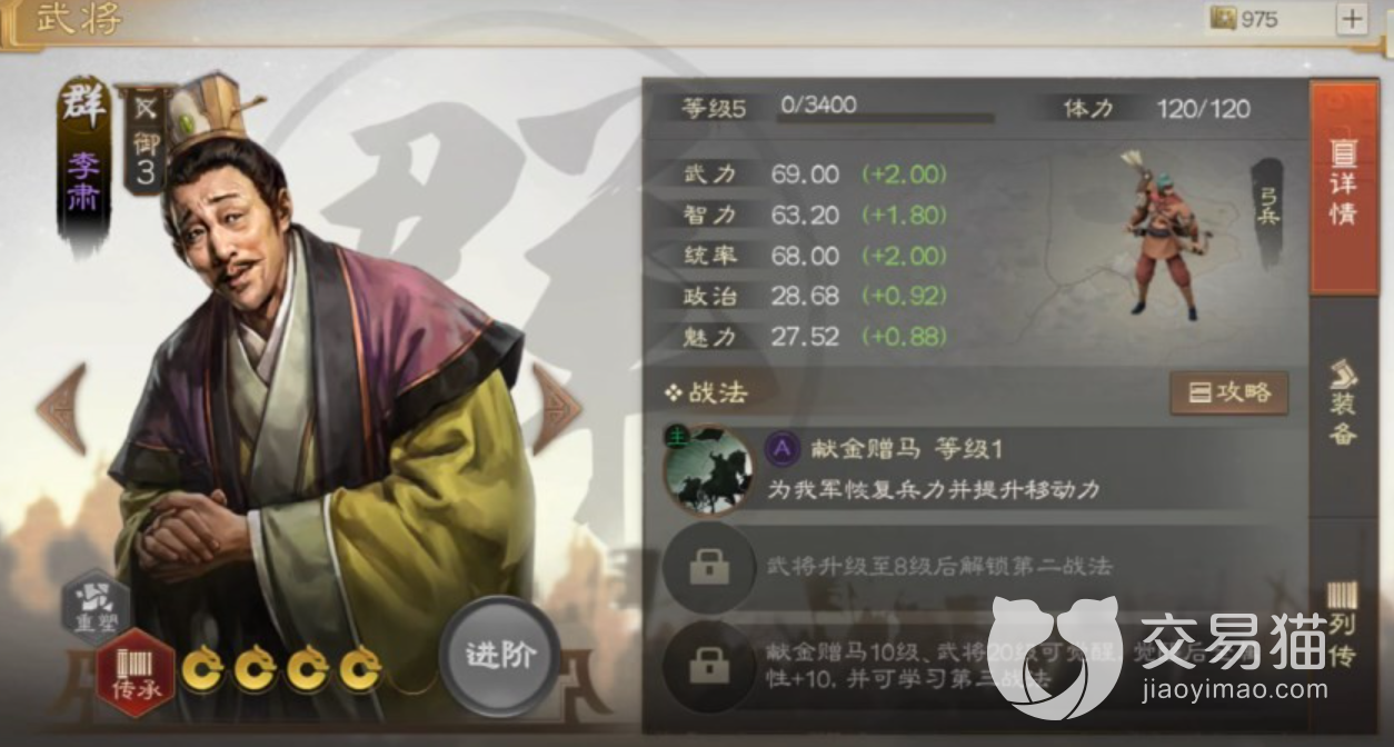 李肃的五项属性中,比较高的是武力,智力和统率这三项,它们在每级的成长数值上也分别达到了2,1.8和2点,这证明其在兵刃和谋略这两类战法的伤害上会有着比较高的造诣,然后他的政治与魅力成长性都小于1,这反应了他在为官时收益会非常差。