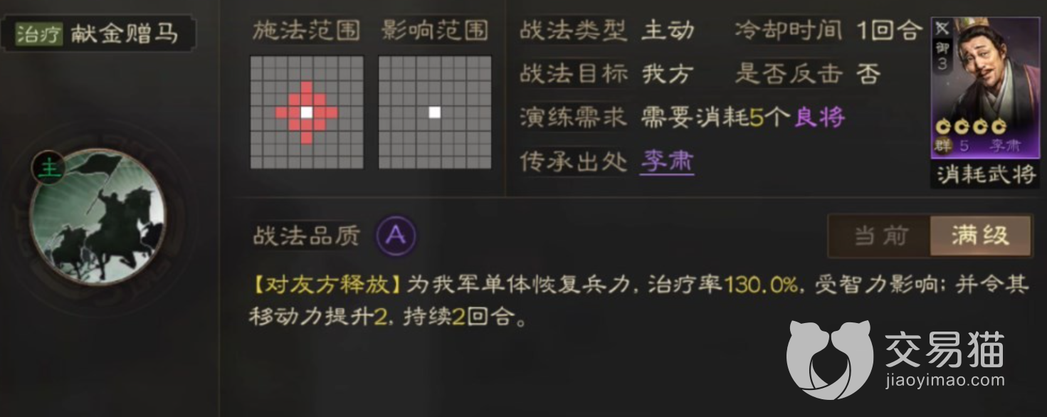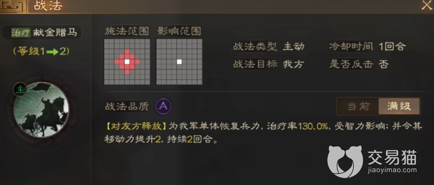 其两个战法都是“献金赠马”,能够令单体目标回复治疗率为130%的兵力,并且数值受到智力加成,然后还可令受到兵力回复的目标额外提升2点行动力。这个战法对于残血友军的帮助还是很大的,特别是经过传承后,可以先后作用两个目标,让他们回满状态的同时还得以撤退。