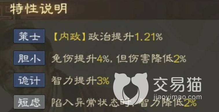 特性上,它有着“策士”,“胆小”,“诡计”和“短虑”这四项,品质并不是很高,而且普遍都是这类智力型武将常有的特性,其中策士提升的政治稍微弥补了一下李肃这项属性的不足,胆小则是加免伤降伤害的双刃剑,诡计提升的3%智力却是最为实用,短虑的话则是一个受到控制后减少智力的负面特性。