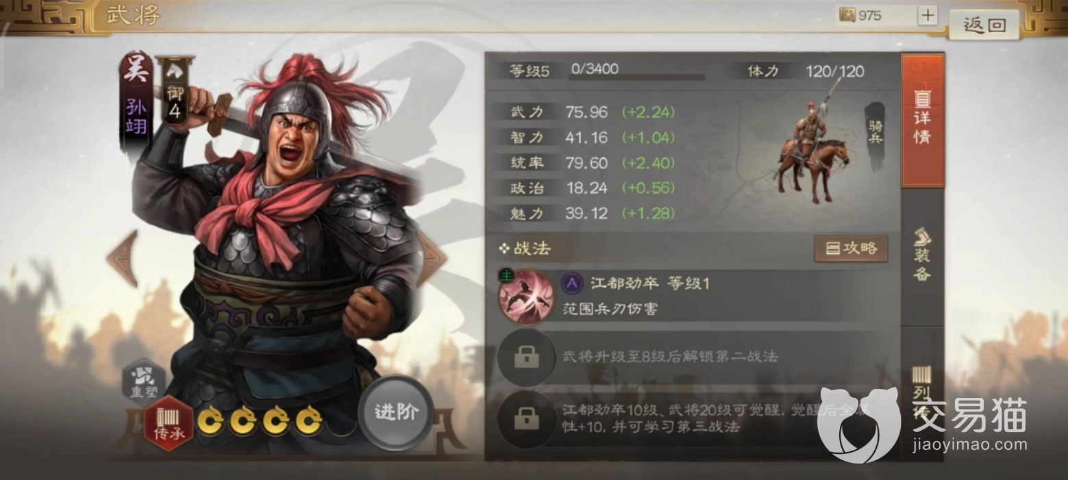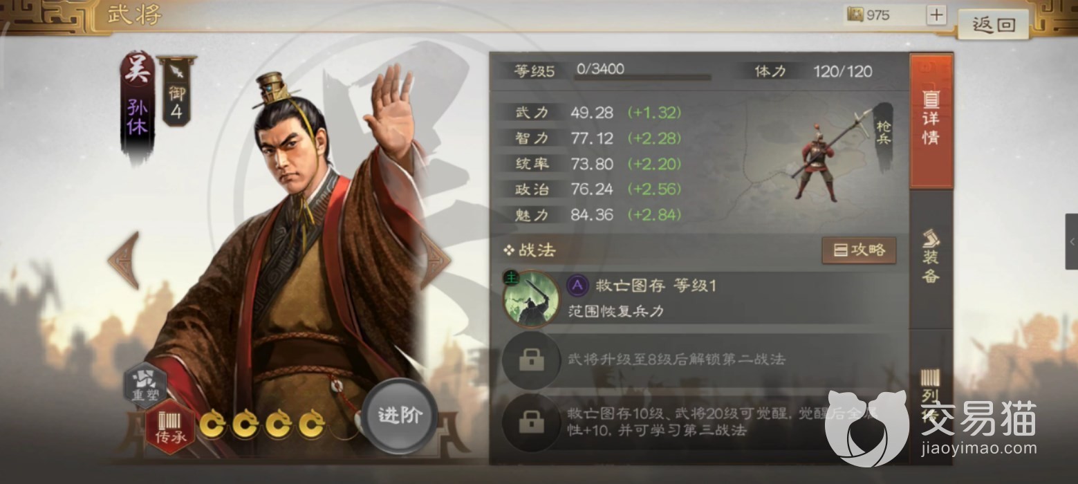 孙翊的初始武力值和统率值都挺高,在同类型的紫将中可以排在前几,统率骑兵冲阵。自带主动战法可以造成可观的范围伤害,搭配横扫千军这种同类型的范围技,能有效冲入敌阵压低敌方血线。武将特性也有4%的伤害加成。