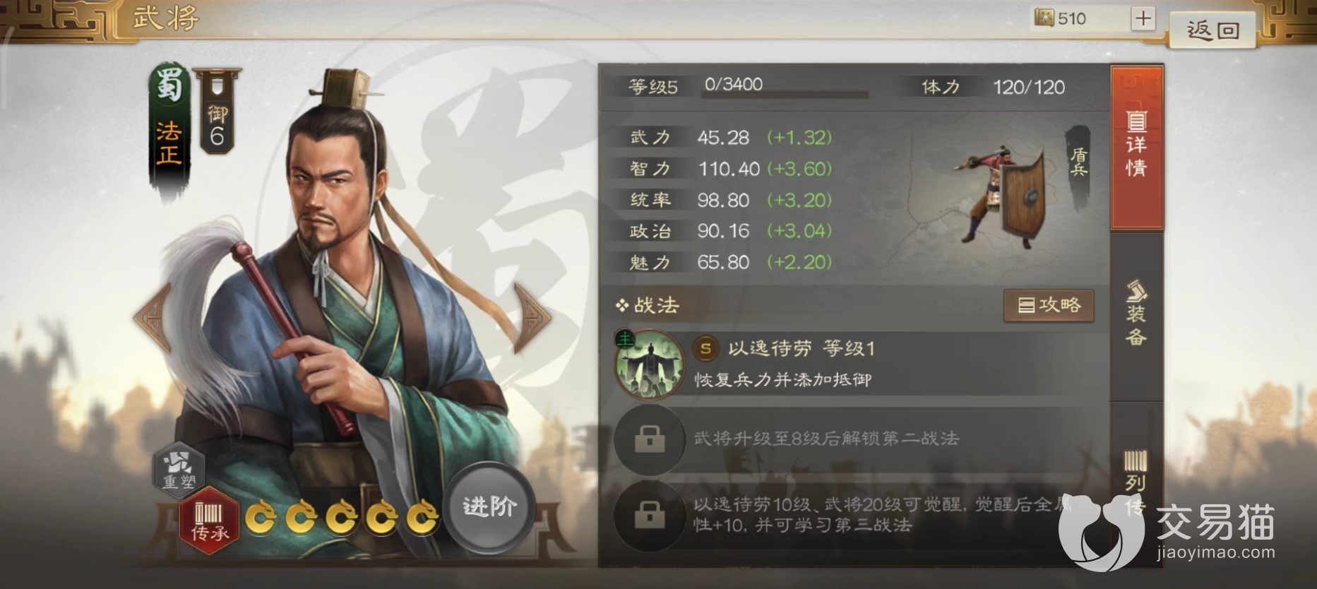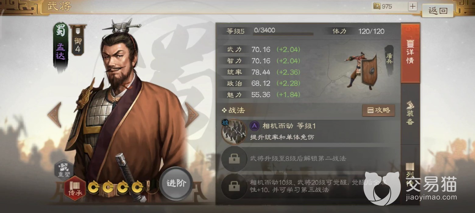 游戏里孟达统率盾兵,是个前排单位,各方面属性都不低,尤其是与战斗相关的属性,初始都在70+。自带战法不仅能提升最高40点的统率还可以免疫28%的单体伤害,搭配固若金汤战法继续提高坦度。