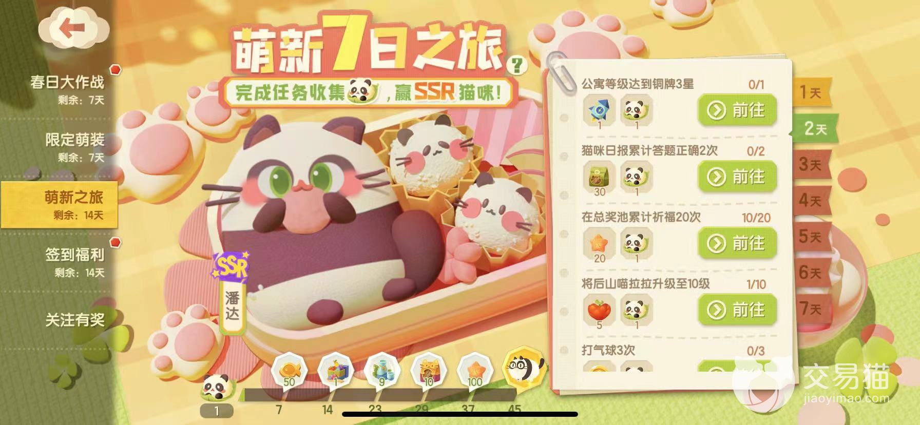 目前游戏内获取猫咪的方法有三种,首先第一种就是通过活动以及新手任务获取,玩家们在刚刚注册好账号进入游戏的时候,系统给我们两个玩具,玩家们只需要在其中任选其一就可以,这两个玩具都能帮助我们吸引一个小猫咪,小编推荐向日葵,可以获取的猫咪属性值更好一些,另外,玩家们在参与游戏内的活动时也可以解锁特定的猫咪,活动是随时开放的,我们可以按照要求完成指定任务,到最后一步就可以领取一个可爱的小猫咪了。