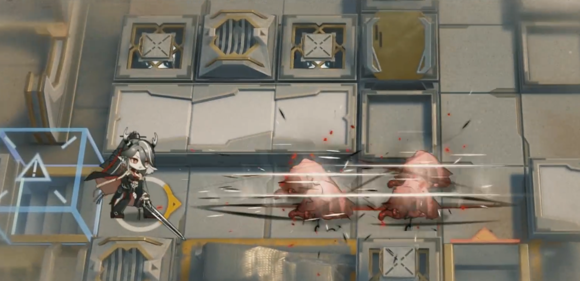 二技能看上去像是类似陈sir的拔刀技,攻击范围为4格,有两次攻击判定,对前方所有敌人造成伤害,并且对身上挂有印记的敌人造成短暂停顿,属于爆发型技能,控制效果聊胜于无,推测专精之后也是可以落地点火的拔刀技。