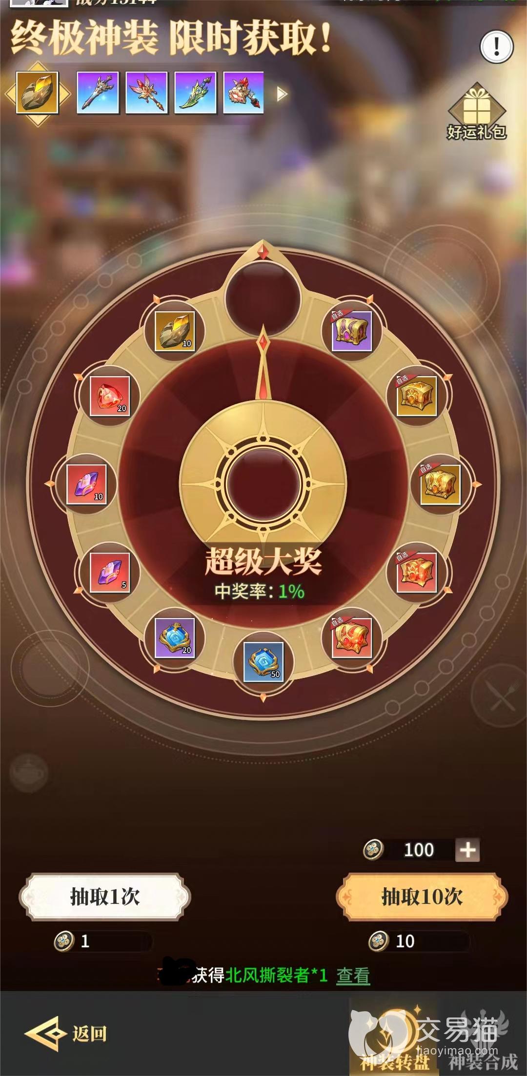 另外品质更高的终极神装也会限时开放获取途径,最常见的两个限时活动就是神装转盘和神装合成,它们里面的大奖就是终极神装,但仅有1%的概率,不过对于玩家前期来说,哪怕不抽到最好的神装,抽到上面的史诗或者传说装备宝箱也相当值得了。